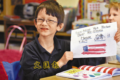 ■加州7歲的阿龍,希望奧巴馬令天空下糖果雨。 美聯社