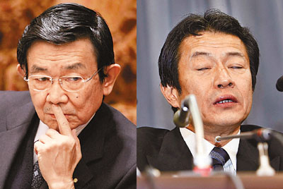 ■中川昭一昨日宣布辭職時,狀態繼續不穩,一度反白眼。左為經濟財政大臣與謝野馨。 路透社