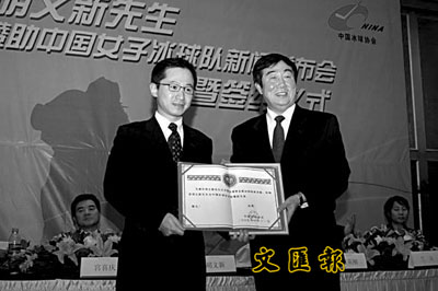 香港商界名人胡文新一向熱心支持冰球運動在本地及內地的發展,先於2001年成立香港業餘冰球會,繼於2007年創辦了香港冰球訓練學校。胡文新更自去年開始贊助中國國家女子冰球隊,支持中國女冰備戰2010年溫哥華冬季奧運資格賽,最終女冰不負眾望,成功取得冬季奧運的入場券。胡文新於2009-2010年度繼續大力支持中國女冰,協助女冰在冬季奧運會爭取優異成績作最充分的準備。有關簽約儀式於日前在哈爾濱舉行。