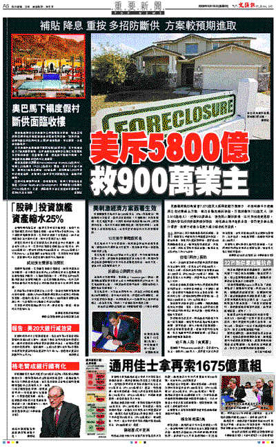 美國總統奧巴馬簽署7,870億美元振興經濟方案翌日,本港時間今日凌晨再公布拯救業主方案,解決金融危機的禍根。方案將動用750億美元(約5,816億港元),拯救900萬業主,避免陷入斷供困境,比外界預測更進取。計劃內容包括向按揭商提供誘因,降低業主每月還款金額,容許更多業主進行重按,並賦予破產法官更大權力修改抵押貸款。