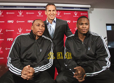 馬里安(左)與賓克斯(右)日前正式從邁阿密熱火改投多倫多速龍,二人周二與速龍總經理哥蘭基路會見傳媒。 路透社