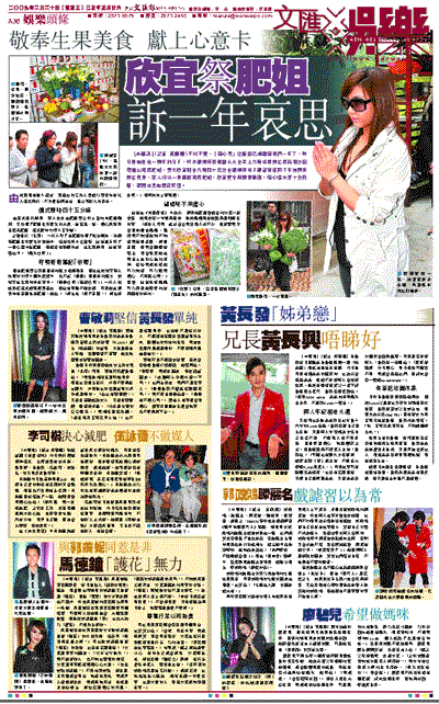 因為肥組靈位與張國榮和羅文毗鄰而居,因此在陳淑芬等人準備的約四十個附薦袋中,也不忘「哥哥」張國榮和羅文,陳淑芬在化寶時亦有高呼:「哥哥收洁I羅記收洁I」一行人完成祭祀儀式就離開寶福山,但欣宜明顯不欲多談,問到她在拜祭時有甚麼告訴肥姐?她說:「講鱁捸]講了甚麼?)講鬫n多洁C」隨即匆匆上車離開。