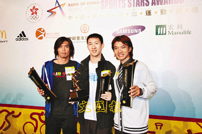 ■蘇樺偉(中)、黃金寶(右)與陳敬然同獲傑出運動員獎時合攝。