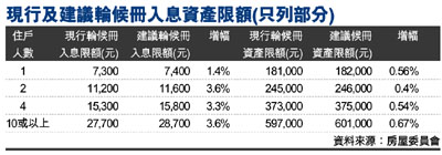 現行及建議輪候冊入息資產限額(只列部分) (圖)