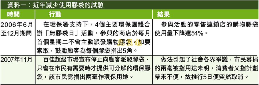 資料一:近年減少使用膠袋的試驗 (圖)