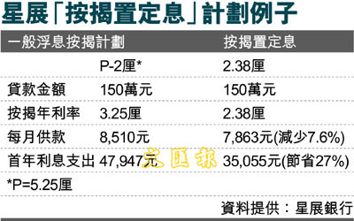 【本報訊】(記者 趙建強)經過去年的貸款緊縮期,多間銀行開始出手搶攻按揭市場,繼周一東亞銀行宣佈推出首年2.48厘定息按揭後,星展亦於昨日宣佈,為中原地產客戶提供首年2.38厘定息按揭,估計首年利息支出可較一般浮息按揭節省27%。