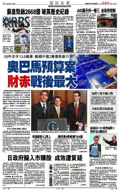 美國總統奧巴馬於美國時間周四公布上任後首份預算案大綱,今個財政年度預期會出現1.75萬億美元(約13.6萬億港元)赤字,相當於國內生產總值(GDP)的12.3%,是二次大戰後最高比例的赤字亦遠高於去年4,500億美元的歷史新高。預期2010財政年度的預算總值3.552萬億(約27.5萬億港元),赤字預計減低至1.17萬億美元(約9.13萬億港元)。