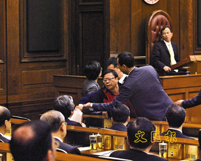 ■社民聯黃毓民等大鬧議事廳,干擾財政司司長曾俊華宣讀預算案。 資料圖片