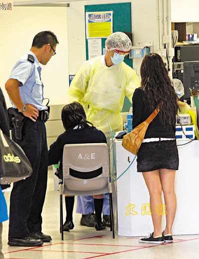 ■在警員和醫生的陪同下,涉索K的女生在醫院內登記。本報記者溫瑞麟 攝