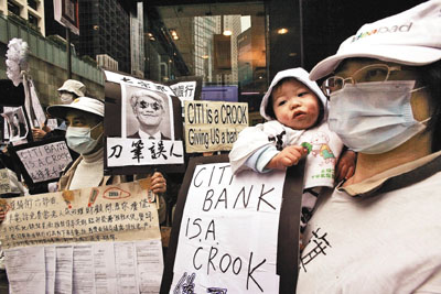 ■金管局公布,共有4,914宗涉及雷曼兄弟相關投資產品的投訴人與有關銀行已達成或即將達成自願和解,其中涉及部分或全數賠償。圖為一名手抱嬰孩的雷曼苦主在銀行門外抗議。 資料圖片