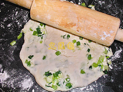 再在麵皮上塗油、灑鹽及蔥花,將麵皮像捲蛋一樣捲起來,將蔥油卷打圈圍成餅狀,再以麵粉棍壓成圓餅;