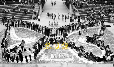 1日,廣州長隆歡樂世界舉行女士「人肉骨牌」活動,慶祝「三八」國際勞動婦女節。由300多名女士組成蝴蝶圖案的「人肉骨牌」活動吸引了大批遊客。 新華社