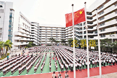 英華建校宗旨是溝通中西文化。圖為學生參加升旗儀式。
