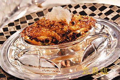 除了點心,另有一款燕窩蟹蓋全日供應,讓大家全天候養顏。蟹蓋內有即拆的鮮紅蟹肉、雞粒、洋蔥粒、白菌、金華火腿茸,先炒香餡料,放回蓋後加入忌簾、奶、牛油、雞蛋、芝士粉焗香,鋪面再添5錢燕窩,味道一絕。