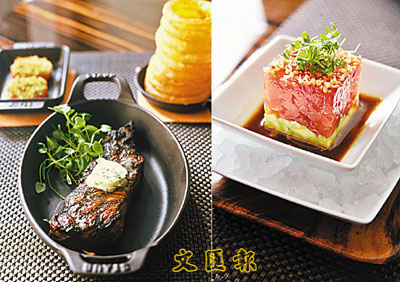 (左)餐廳選用頂級牛扒,在存放過程中更致力保持其肉質的鮮嫩。(右)牛油果大豆青檸汁伴吞拿魚他他。