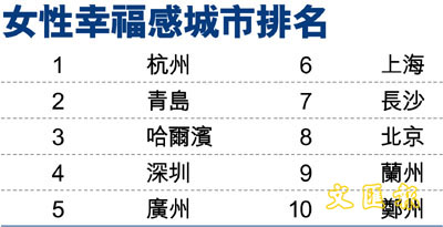 全國婦聯近日發佈第4次中國城市女性生活狀況調查,調查結果顯示,在內地10個大中城市中,杭州和青島的被訪者幸福感最強,哈爾濱市女性幸福感列第三,較07年躍升10位。哈爾濱市女性最看重家庭和睦家人平安。