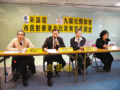 九龍社團聯會及新世紀論壇於本月訪問了1,155名市民,了解他們對香港文化政策及西九文化區發展的意見。調查結果顯示,有33.9%受訪者不同意香港是「文化沙漠」,同意者有32.4%。被問及他們對文化藝術活動是否有興趣時,有53.9%表示「有些興趣」,23.3%表示「沒大興趣」。同時,有49.1%認為特區政府重視文化藝術,44.5%則表示不重視。不過,有41.8%受訪者認為香港目前的文化藝術活動不能滿足他們的需求,表示滿足到的只有19.6%。而在文化推動工作方面,有37.7%不滿政府在推動本地文化方面的工作,其次為不滿中國傳統文化推動工作的有37.6%,只有22.1%受訪者不滿意西方文化的推動工作。