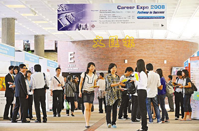 ■大學聯校就業資料庫最新一季空缺大跌近半,只有1,100多個職位,畢業生求職情況告急。圖為大學舉行的職業博覽。 資料圖片