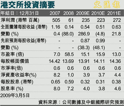 展望未來,我們認為日均成交量將繼續下滑。2009年1月日均成交量為477億港幣,3月4日為450億港幣,預示著2009年日均成交量將進一步同比下滑(預期同比下降40%至432億港幣)。此外,持續較低的利率環境(投資收入佔總收入的13.2%)和提供免費實時交易數據的計劃將加重港交所的收入壓力(信心銷售收入佔總收入的8.9%)。因此,我們對港交所維持賣出評級,將該股目標價格調整為50.40港幣(15倍2009年預期市盈率)。