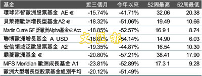 比如佔今年以來榜首的環球沛智歐洲股票基金,主要透過投資於歐洲各國公司所發行之股票,以尋求資本增值。基金在2006、2007和2008年表現分別為28.87%、10.13%及-36.99%。基金平均市盈率和標準差為12.25倍及19.62。資產分布為96.54% 股票及3.46% 其它。