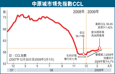 【本報訊】中原地產研究部聯席董事黃良昇指出,截至2009年3月1日,中原城市領先指數CCL報59.45點,較上周公佈的58.62點上升1.42%,為2008年11月9日錄得59.93點後十六周新高。按周樓價上升1.42%,是2008年6月8日按周升1.44%後38周以來最高。