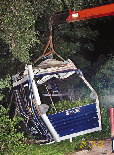 ■昂坪360吊車年前發生墜毀意外。圖為損毀的車廂。 資料圖片
