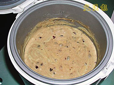 3. 將麵糊倒入電飯煲,加入紅豆略為拌勻,像煲飯一樣按下開關,待開關跳起,即成。