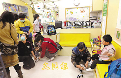 ■香港耀能協會石硤尾幼兒中心昨日復課,教職員為學童換鞋才進入課室。本報記者李志樑 攝