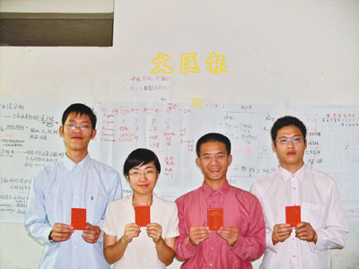 ■4名畢業於廣東不同高校的大學生(左起)陳國烽、駱嫦琳、林金旭、馬錦添手持村民證,本月到三合村擔任副村長、婦女主任等職。