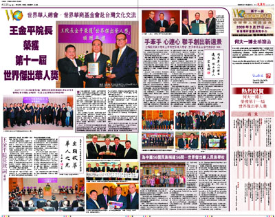 當日在台北獲得台灣「立法院」王金平院長的接見。世界華商基金會同時在台灣「立法院」禮堂舉辦「台灣『立法院』王金平院長榮獲第十一屆世界傑出華人獎」的頒獎儀式。