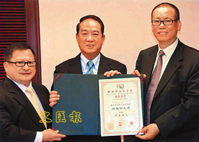 ■世界華商基金會會長馮成博士(右)及行政總裁馬興利博士(左)頒發委任書予台灣親民黨主席宋楚瑜先生(中)為世界華商基金會榮譽會長。