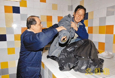 ■本港露宿者人數有增加趨勢。圖為香港勞工及福利局局長張建宗替露宿者穿上新外衣。資料圖片