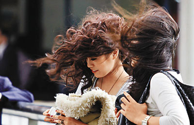 ■市區昨中午錄得攝氏25度高溫,但天文台在下午發出強烈季候風信號,市面颳起大風,街上少女被吹至頭髮蓬鬆,晚上氣溫急降至攝氏13度。 本報記者劉國權 攝