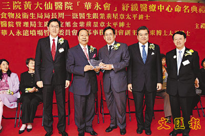 【本報訊】 東華三院黃大仙醫院日前舉行「華永會」紓緩醫療中心命名典禮,食物及衛生局局長周一嶽醫生、醫院管理局主席胡定旭及華人永遠墳場管理委員會(華永會)外部事務委員會副主席陳東博士蒞臨主禮。