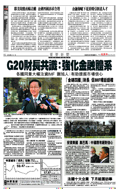 【本報訊】綜合中通社、新華社15日電:在英國舉行的二十國集團財長和央行行長會議14日閉幕。會議發表一份聯合公報,與會者同意採取一切必要措施,支持借貸,改革和強化全球金融體系,盡全力振興世界經濟,並要求國際貨幣基金組織(IMF)對刺激措施進行監督。中國財政部長謝旭人表示,會議向外界傳遞了國際社會共同應對經濟、金融挑戰的積極信號,在一定程度上有助於提振市場信心,促進經濟和金融形勢的穩定。
