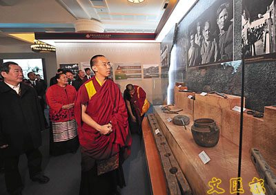 15日,第十一世班禪額爾德尼.確吉傑布來到北京民族文化宮,參觀正在這裡舉辦的「西藏民主改革50年」大型展覽。班禪參觀完展覽後表示,展覽真實再現了舊西藏農奴制的黑暗和人民悲慘的生活境遇,充分展示了50年來西藏的滄桑巨變,勞動人民成為西藏的主人。 文/本報記者軼瑋 圖 新華社