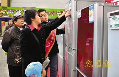 ■15日,北京市工商局在房山區華冠購物中心廣場開展「家電下鄉」政策宣傳諮詢活動。北京市工商局表示,將嚴厲查處借「家電下鄉」等名義向農村銷售翻新廢舊家電產品的不法行為,防止將城市商品簡單推向農村甚至將滯銷商品向農村轉移。 新華社