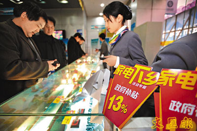 【本報訊】據中新網15日電:據悉,國家補貼13%的家電下鄉行動開始後,重慶鄉鎮的家電市場也成了上榜企業和非上榜企業的戰場。一家銷售點老闆說,他的店裡家電下鄉產品已經佔到80%,像一款不享受補貼的產品,以前每月還能賣個幾台,現在幾乎賣不出去。