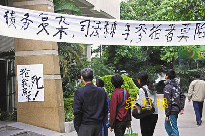 業主代表鄭先生介紹,兩三年前,廣州荔京閣房產發展有限公司將旗下樓盤荔京閣2樓13套房產以稍低於市價的價格出售,吸引不少人前來認購,最後,13處房產以每平方米6,000至8,000元左右的價格出售,開發商賣樓所得超過千萬。售罄之後,雖然業主將所有手續費交齊,但房產證並未辦妥,開發商稱兩家股東在部分細節存在糾紛,但不妨礙今後業主辦房產證,業主信以為真。入住兩年之後,房產證問題一直未能解決,今年3月11日,某拍賣行在小區貼出通告,稱13戶業主的房產將於27日拍賣,業主得到消息後十分震驚,遂舉行集體抗議活動。