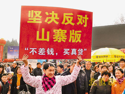 正當「山寨」旋風席捲內地的時候,昨日河南鄭州一個「3.15消費者權益日」的活動上,有人舉起「堅決反對山寨版」的牌子,倡導民眾購買品牌商品。 中新社