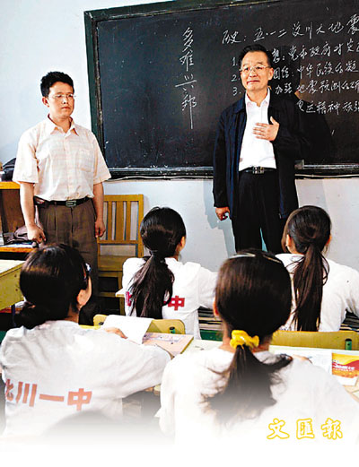 在此期間,溫家寶總理曾親臨北川中學復課點,飽含深意地在北川中學臨時教室的黑板上寫下四個遒勁的大字:多難興邦。