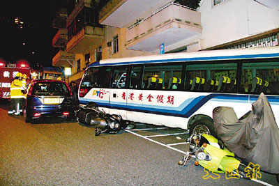 【本報訊】北角健康西街昨晚6時45分發生驚險車禍。一部24座旅遊巴,由健康西街南行擬右轉入七姊妹道時,花甲司機報稱疑因血壓低想暈,在轉彎時失事越過七姊妹道,直衝上健康西街行人路,撞毀路欄及路牌,再衝向路旁電單車位,一列共13架電單車如「骨牌」般被掃跌倒下,有2名女途人驚聞巨響受驚跌傷,其中一名女子更被倒下的電單車壓傷肩背;一輛剛巧經過的私家車,亦被其中一輛倒下電單車擊中右車尾。