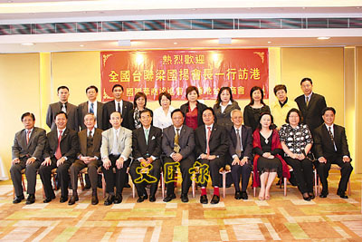 【本報訊】國際華商協進會會長蘇永安和香港台灣商會會長黃茂雄日前率員,在銅鑼灣世貿中心宴請中華全國台灣同胞聯誼會會長梁國揚及其隨員。中聯辦台灣事務部副部長何志明應邀出席了歡迎會。
