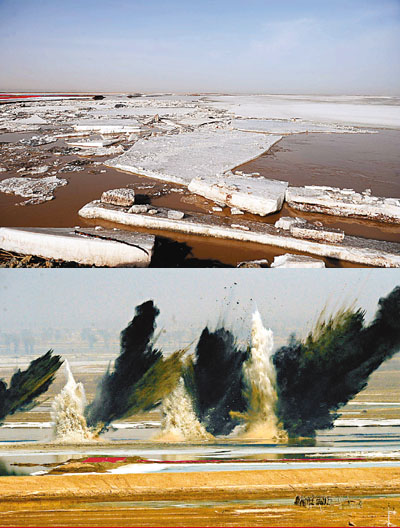 18日,中國人民解放軍空軍某部出動3架轟炸機在黃河內蒙古達拉特旗恩格貝鎮蒲圪卜河段冰淩區執行防淩任務,將堵塞在河道中的冰淩炸碎,疏通河道。上圖:黃河內蒙古達拉特旗蒲圪卜河段河面流淩。下圖:空軍轟炸機在黃河內蒙古達拉特旗河段炸冰淩。 新華社