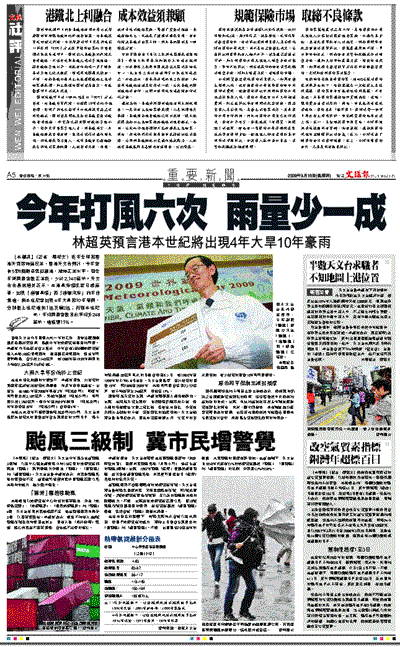 【本報訊】(記者 羅敬文)近年全球和香港天氣都持續反常,香港天文台預計,今年會有5至6個熱帶氣旋襲港,維持正常水平,但全年降雨量會較正常低,少於2,140毫米。天文台台長林超英表示,本港旱澇情況將日趨嚴重,出現「極端旱情」和「極端汛澇」的年份急增,料本世紀會出現4年大旱和10年豪雨,分別較上世紀增加1倍及逾2倍;而到本世紀末,年均雨量會較目前平均多248毫米,增幅達11%。