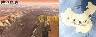 到美國西部旅遊的人士必然會到大峽谷觀光,欣賞它色彩斑斕的岩層和險峻的峭壁。大峽谷總長度約為446公里,深1.8公里,寬6至29公里,對渺小的人類來說,確是龐大而壯觀的地貌,可是相比火星上的「水手峽谷」,卻猶如小巫見大巫。水手峽谷由美國水手9號火星探測器於1972年首先發現,因而命名。這個火星的大峽谷長度達4,000公里,深7公里,寬200公里,足足沿火星赤道環抱火星四分一周。上圖把水手峽谷套在中國版圖內,讓讀者更能體會火星峽谷的龐大。大約在40至20億年前,火星剛形成不久,表面冷卻,形成岩石地殼,但內部仍為炙熱的岩漿,岩漿因高溫而向外膨脹,逼使脆弱的地殼爆裂,形成現今的水手峽谷,或許1百年後,人類終會踏足水手峽谷進行探測。
