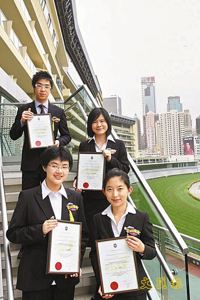 ■今年16歲的「小神童」何凱琳(前左),在中大醫學院實習中體會人生百態。其他賽馬會獎學金得獎學生為教院的盧鴒(前右)、演藝學院的司徒健(後左)及嶺大的康舒暢(後右)。本報記者莫雪芝 攝