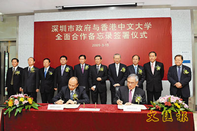 本港大學北上步伐再次加快。香港中文大學和深圳市政府昨日上午在深圳虛擬大學園區簽署《全面合作備忘錄》,雙方將加強兩地對學歷和文憑互認,加快合作辦學及科研的進展,並計劃合建世界級的重要實驗室。中大深圳研究院大樓動土典禮亦於同日舉行,預計2010年可落成投入使用。中大校長劉遵義盼望可盡快在深圳實現獨立辦學,若能獲批,辦學初期將以理工科課程為主,以配合當地高科技產業的發展。