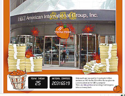 「花紅門」導致民怨沸騰,MoveOn.org網站推出擲「虛擬番茄」小遊戲(見圖),網民可向AIG大樓門口擲番茄洩憤。網站還發起網上請願書,促請國會收回AIG獲公帑注資後派發的超過2億美元(約15.5億港元)花紅。 ■路透社/綜合外電消息