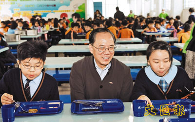 ■曾特首與小學生共嚐綠色午餐後說:「看我們將午餐吃得乾乾淨淨,就知道食物很對胃口。」